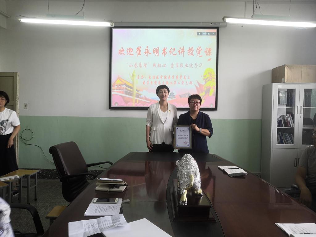 最后为表示对崔书记的感谢,药学系党总支书记王淑荣同志为崔永明同志颁发了党课纪念证书并合影留念。
