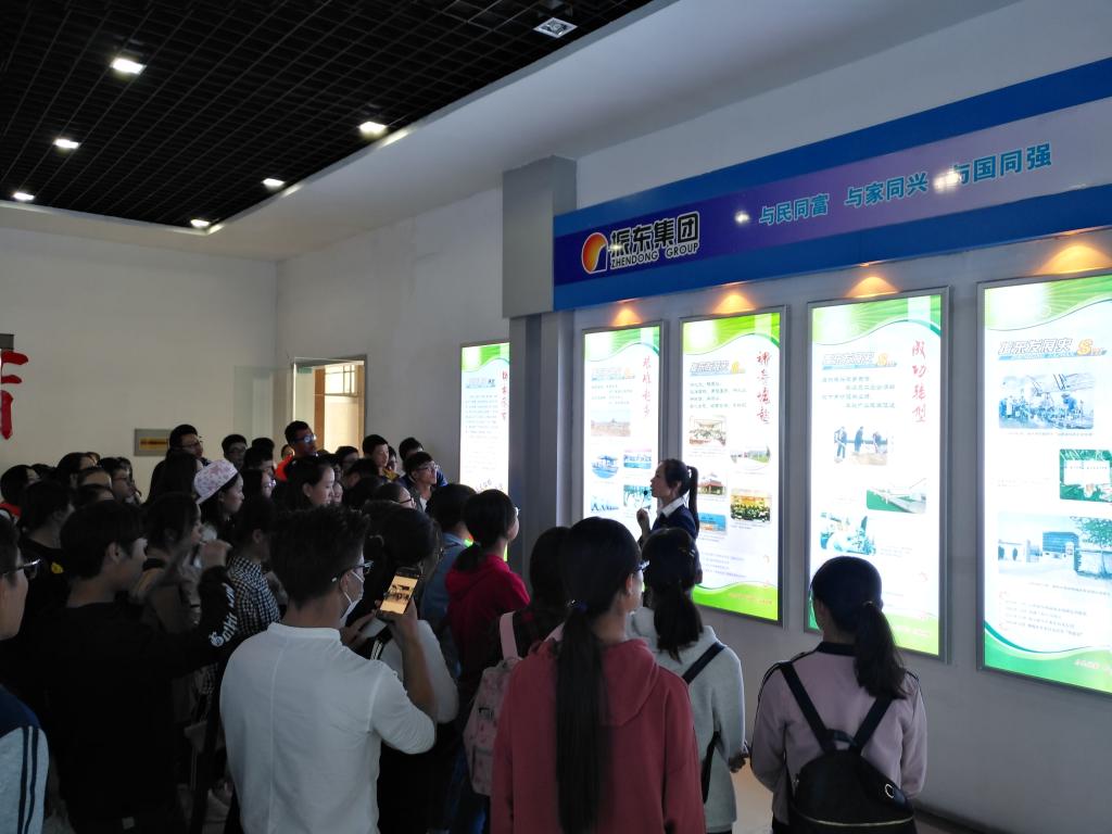 首先,在振东集团相关负责人的带领下,参观了振东集团的展览馆,在老师的讲解中,了解到该集团发展前身和发展历史,及其创立、转型发展等,并介绍了振东集团生产的相关产品及“振东精神”、“振东人”,管理理念等多方面的内容。从振东的发展贯穿17级新生的求学之路,人生之路;以振东艰苦卓越的发展、创新来影响新生的心志;以振东逐渐完善的体系来启发新生自我完善